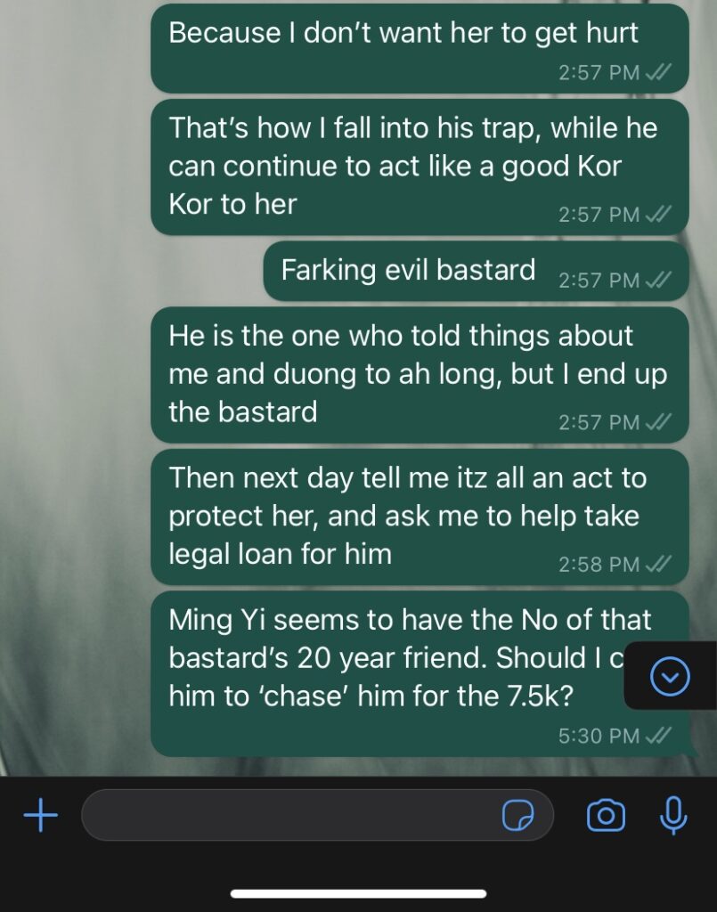 Today is already the 12th. Tomorrow will be the 1st repayment of the 1st legal loan I took under my name for your Dec CPF money. That bastard really not planning to return me the money he owe me…